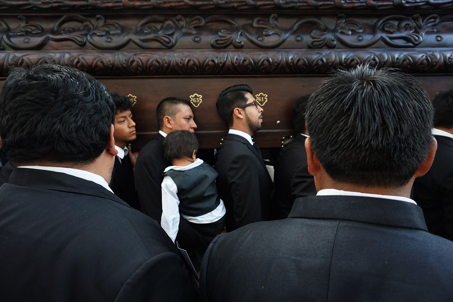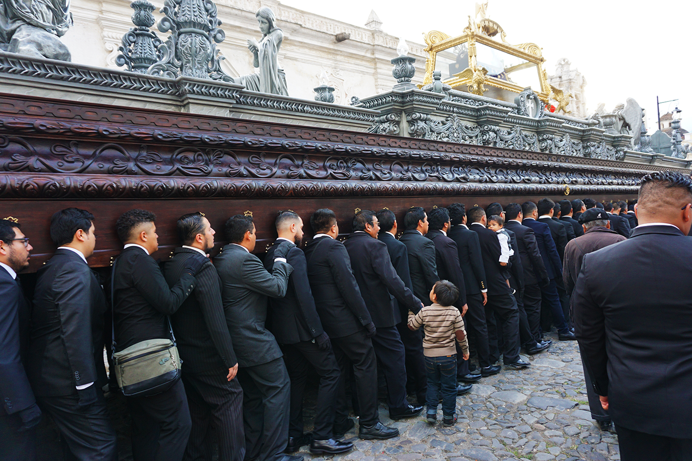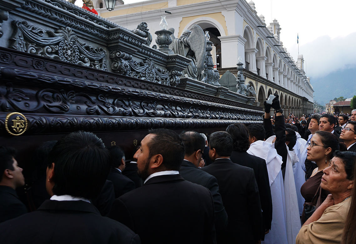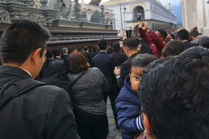 The parade turned out to be the All Souls procession that takes place at the end of the day on November 1st. It felt very similar to the Holy week processions we saw in Spain with some differences. The music that accompanied this march through the streets was very dirge-like and performed by scads of tuba players. Nothing does dirge like a tuba. The second thing, it was a sea of black. Spiffy black suits for the men and black dresses for the women. Everyone local that is. Us clueless tourist stood around (and out) dressed in shorts and t-shirts. We didn’t see any guys in pointy hats either but as we were at the tail end of this, we may have missed them. The procession float was massive, definitely larger than the ones we saw for Semana Santa. This ‘float’ was almost an entire block long, made of what looked like solid mahogany and hand carried like the ones in Spain. On top was the lifeless body of Jesus being mourned by the Virgin Mary and the Angel Gabriel at her side.