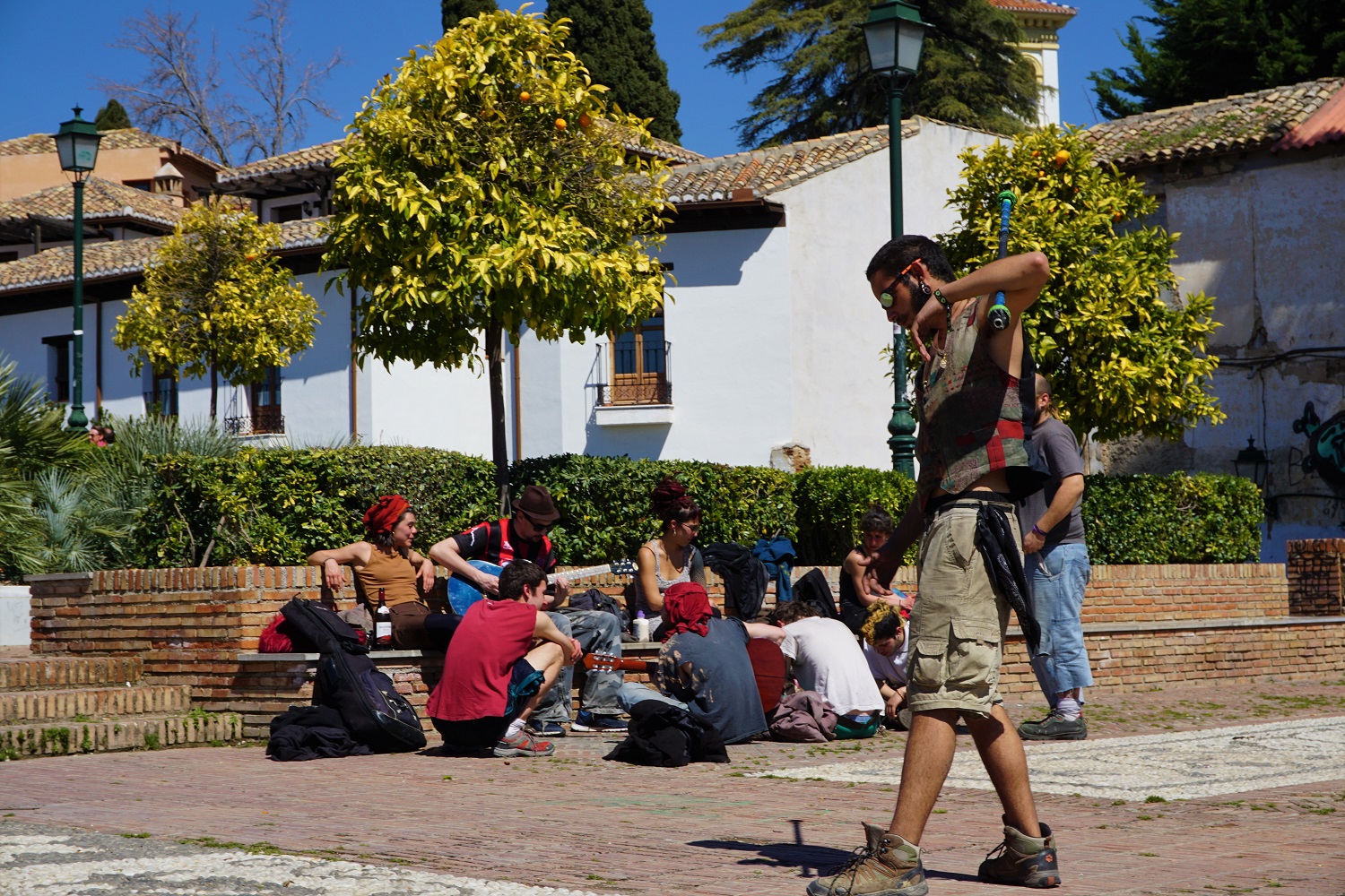 And speaking of hordes, we’ve discovered that at least half of what we thought were strictly tourists are in fact students.  There seems to be quite a large college/university crowd here, especially in the area where we are staying so that probably explains why we keep running into large gatherings of young people in the plazas and tapas bars.  While most look like students, there are a fair number of, for want of a better description, ‘hippies’, dressed in tie-dye shirts, ponchos, colorful scarves, sandals, and dreadlocks.  Wafts of weed and hash.  Some are camped on the hillside in tents or live in microvans and sit around playing guitar, solo or in small groups.  Maybe the gypsies are still here?  It kind of reminds me of travelling in Europe in the 60’s.  It’s déjà-vu all over again, to quote a great baseball player 😊.  I keep expecting Woodstock to break out at any moment.
